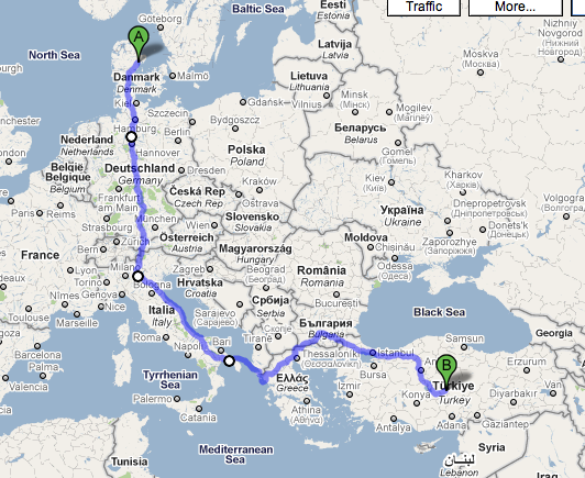 Arhus in Denmark, to Germany, to Switzerland, to the edge of Italy, to Greece via ferry, then to Cappadocia in Turkey : 2,983 miles. 100 days, 3.5 months. Padded to 4.5 months for exploration time.