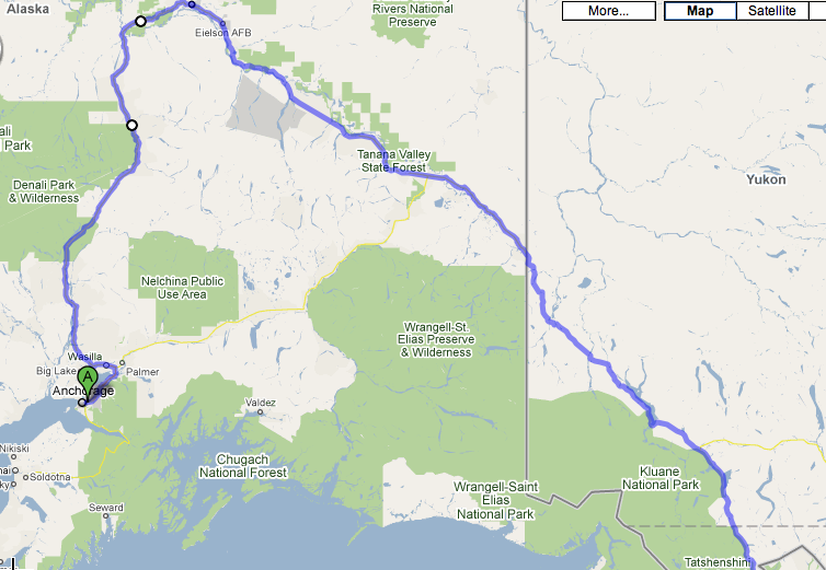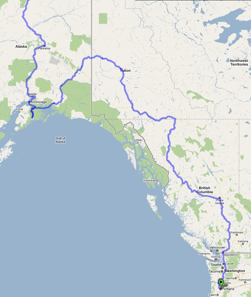 From Portland up through Canada on the Alaskan Highway, northern route through Chicken and down to Valdez, across via ferry to Whittier, a detour to Seward, then up past Anchorage and Denali National Park to Fairbanks. From there, the option of proceeding north on highway 11 to Deadhorse, the roof of the freakin' world.
