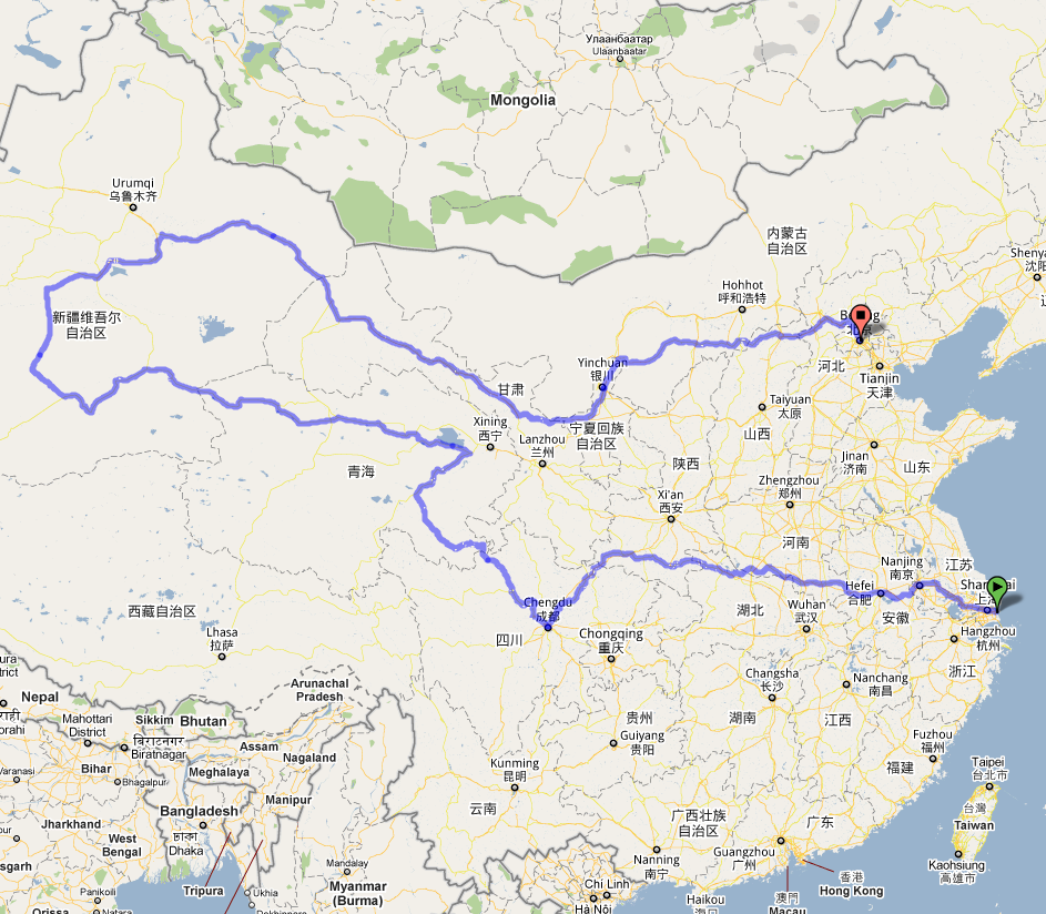 This monstrous route starts in Shanghai and ends in Beijing. The interesting thing about it is, you can cut the distance almost in half, by getting on a train in Bayingolin on the far west end of the route, and riding it all the way into Beijing.