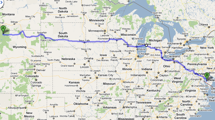 Yellowstone to Bighorn National Forest to Buffalo Gap National Grassland, across the plains to Great Lakes via Minnesota, ferry across Lake Michigan, down through Ohio and Pennsylvania to my sister's place in Trappe, MD. 2153 miles, 43 days (50 miles a day average across the plains), padded to 2 months for time in the parks.