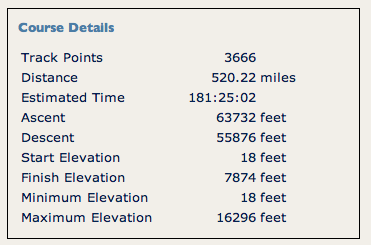 Considered as the full route, it is about 6000 miles. The partial route with the train is 3800 miles of biking, and about 200,000 feet of ascent. If you travel sensibly at about 20 miles a day you will be on the road for an entire year, factoring in the train ride and the surrounding travel and prep time.