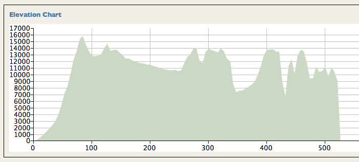 This is some extremely beautiful territory, but also quite dangerous in the last segment. 3750 miles total, with plenty of time for rest and exploration. Count on 20 miles a day or less, average. About 100,000 feet of ascent. That's a seven month journey.