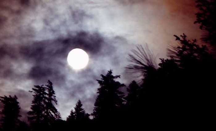 in the evening, I notice that the moon is out, and full. Now would be an excellent time to take some night photos with the camera. I slip on a flannel, and my iPod for mood music, and wander off into the cool blue world. For the first few shots I lie on my back in the middle of the road, with the camera resting on my face, to capture the constellations. All those shots turn out grainy. In fact, most of the pictures turn out grainy, and most of the rest are blurred from my hand-held exposure. Eventually I get the idea to prop the camera on rocks before I take a shot, building little piles of rocks as necessary.