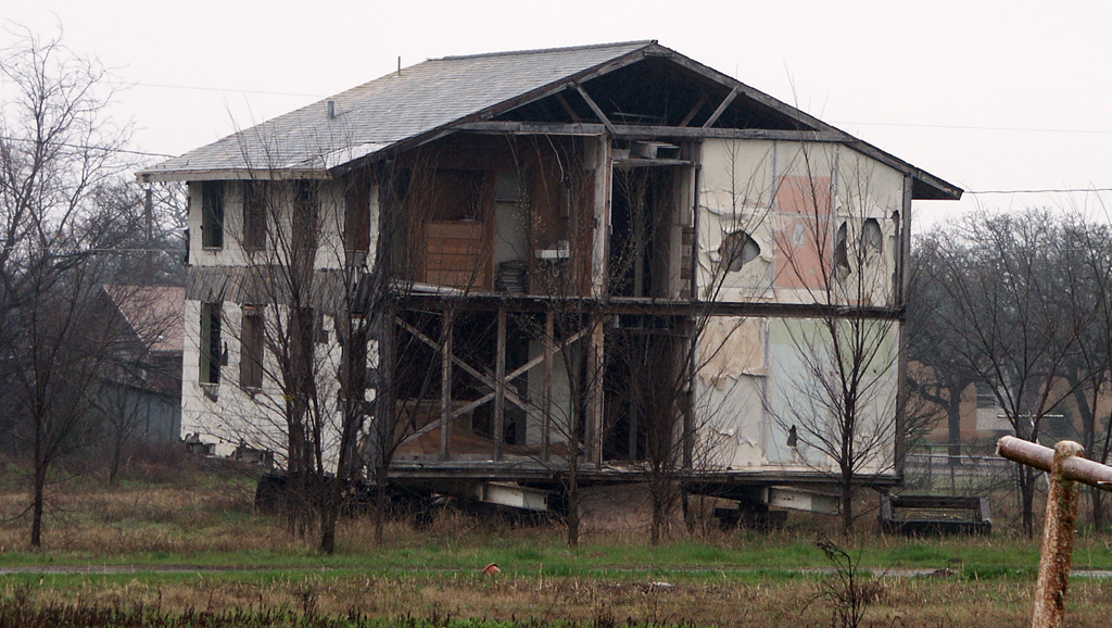 Someone decided that this house was still in good enough condition to salvage even though the land was sold. I wonder how long it's been sitting here, fully furnished, with the walls missing?