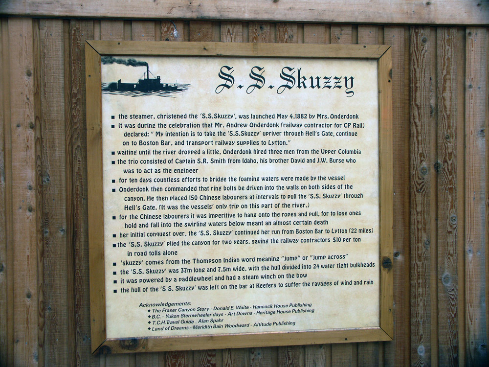 Hell's Gate was well named. It was by far the most difficult terrain for construction of both the highway and the railway. To haul supplies for the railway upstream of Hell's Gate, Andrew Onderdonk built the sternwheeler "Skuzzy."