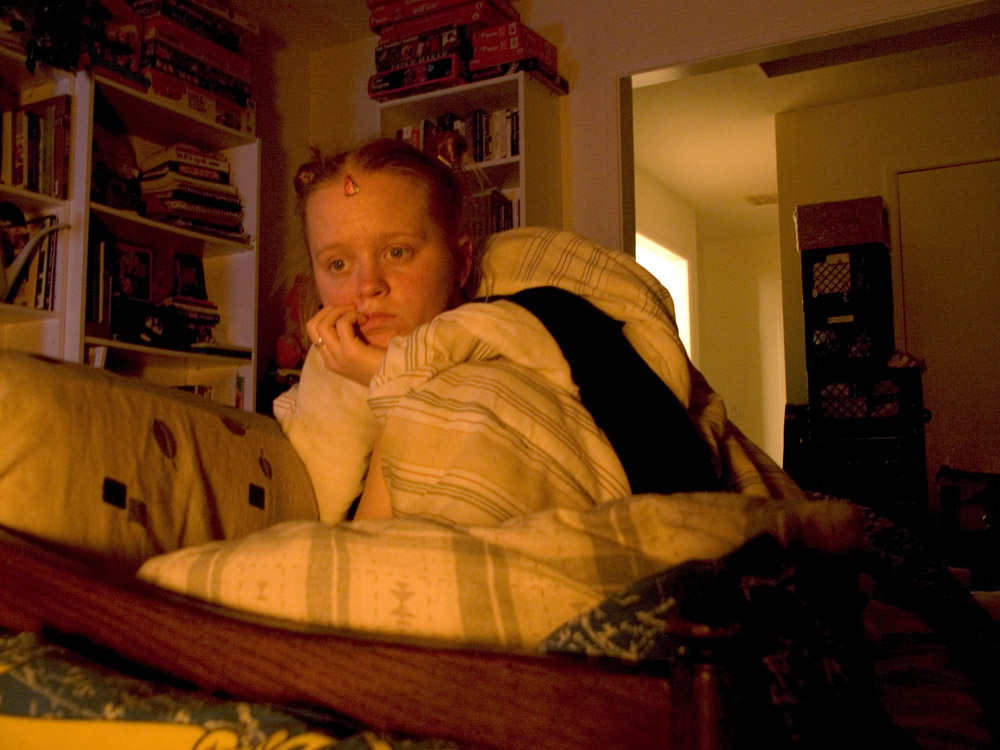Kashy enjoying the fire, with a fruit sticker on her forehead. She helped us pack, too!