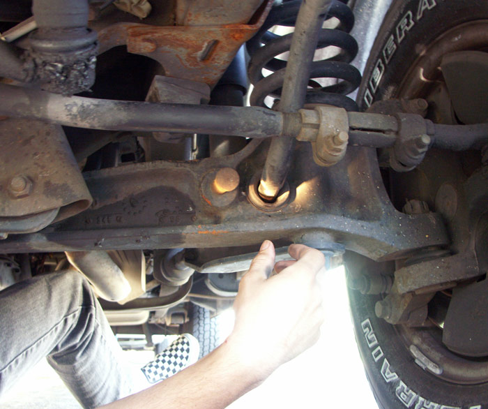 Andy points out an extremely worn bushing on the control arm. It's the source of what he refers to as a "rinky-dink" noise that can be heard in the cab.