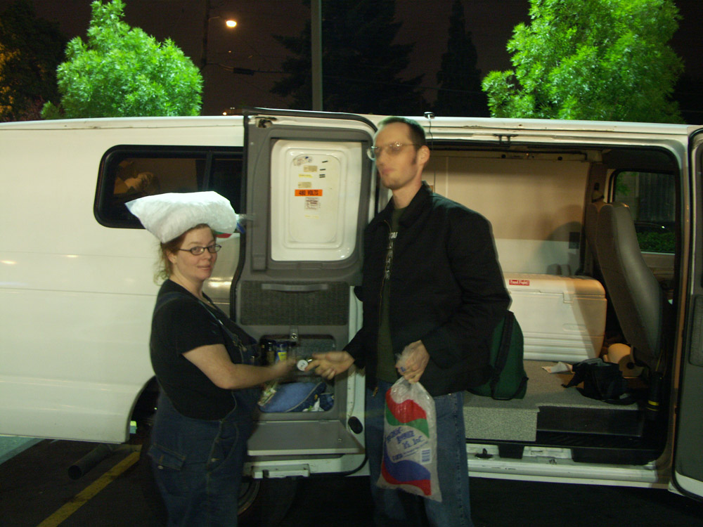 Sherrila shakes hands with Zoggo, as they peruse her spice collection. We've just purchased ice for our gigantic cooler.