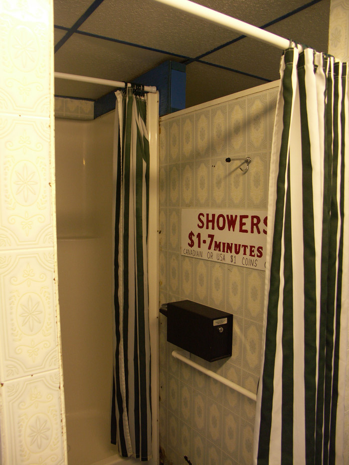 An example of the Fort Nelson "hospitality". This is one of the men's room showers, all of which smell like pee. The women's bathroom featured a broken window with shards still in the frame. The caretaker's solution was to nail a board over it, shards and all. Clearly a quality establishment!