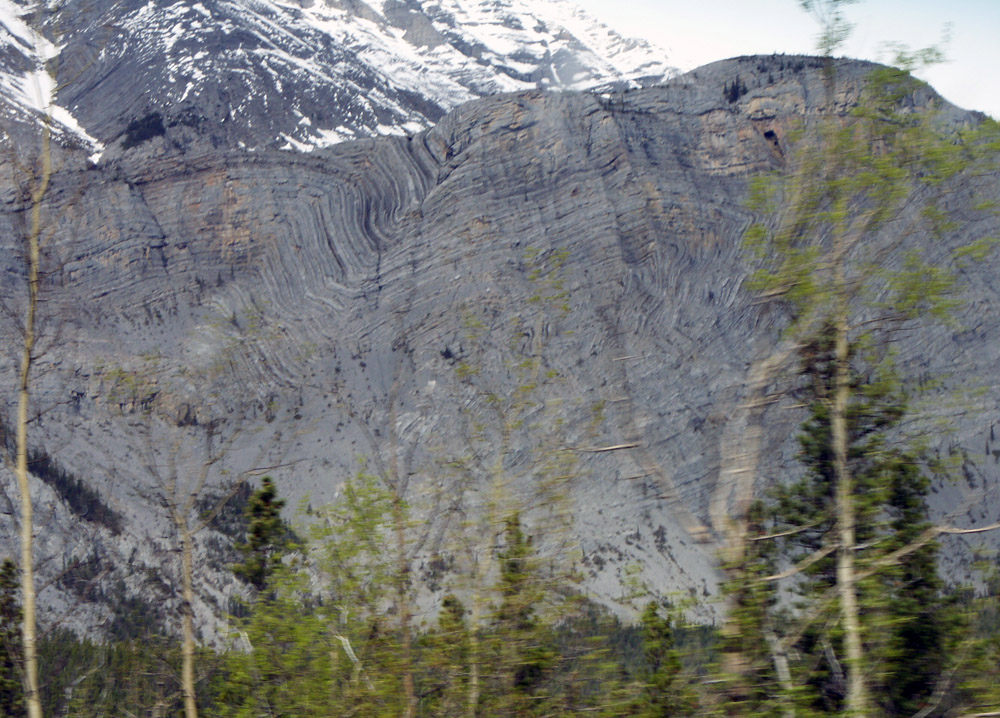 That rock face is thousands of feet high. Note the trees on the upper right. Incredible forces must have bent the mountain range back over on itself, eons ago. An excellent example of vacation geology.