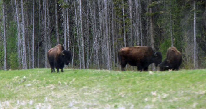 Bison munching at the roadside. These animals are [expletive] huge -- 700 to 1200 pounds each. Ben: "Look! Walking nickels!" Margaret: "Nobody young would get that, honey." Ben: "I know, I know..."