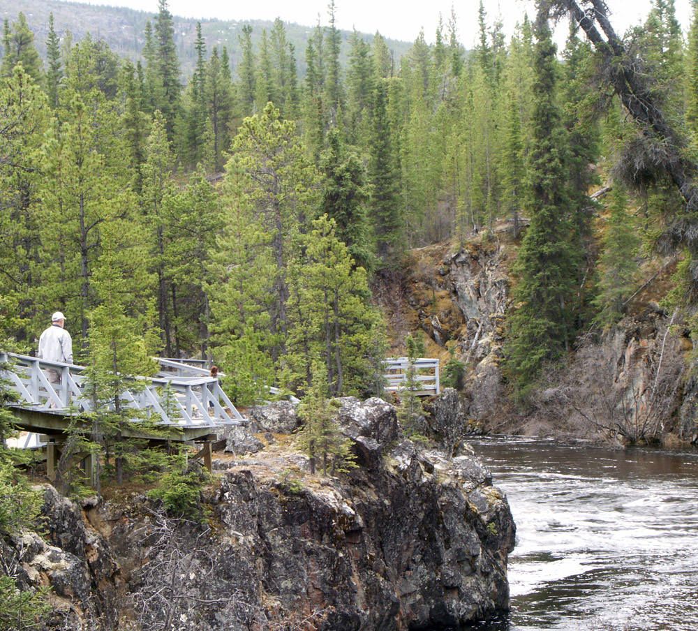 Ben and Sherrila exploring an attractive river 700 miles north of Dawson Creek, and a half-mile from the road, known as Rancheria Falls Recreation Site.