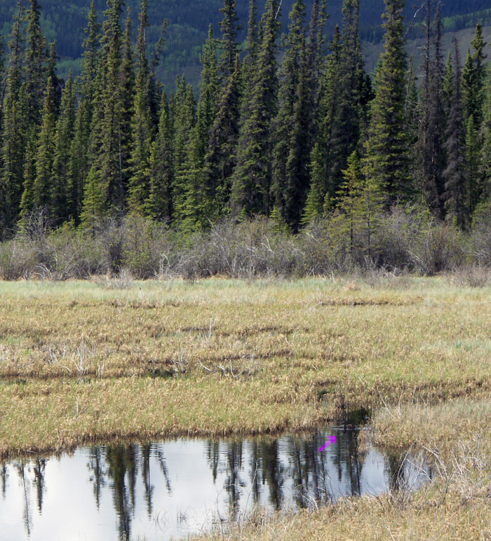 I took a few more pictures of the pond, looking for that irate duck. Three weeks later, I found it in this photograph. Look for the purple arrow.(Ben did not approve of this caption, he thought it was, quote, "dumb". Hee hee.)