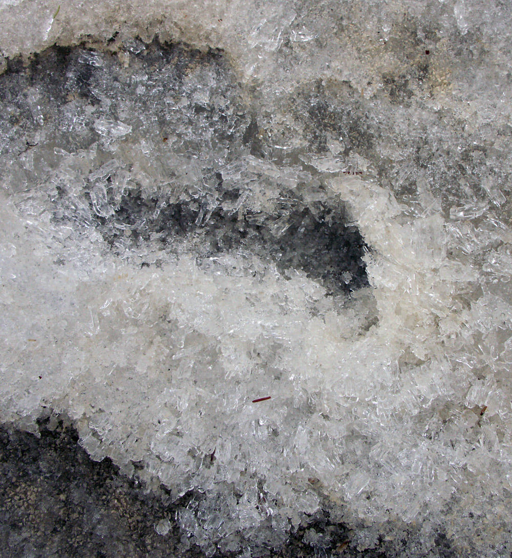 Rough shards of ice, packed down in layers below the fresher snow. This patch was revealed when Ben scraped rocks against the snowbank, while searching for agates.