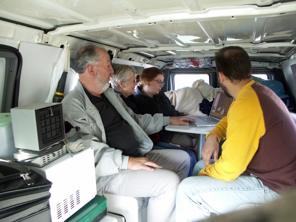 Reviewing pictures in the van