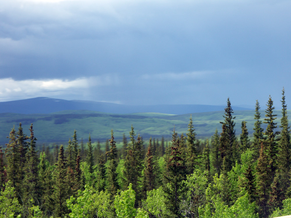 A rainstorm in the distance. The photo has a strange blur because it was taken out the window of a car going 75mph.