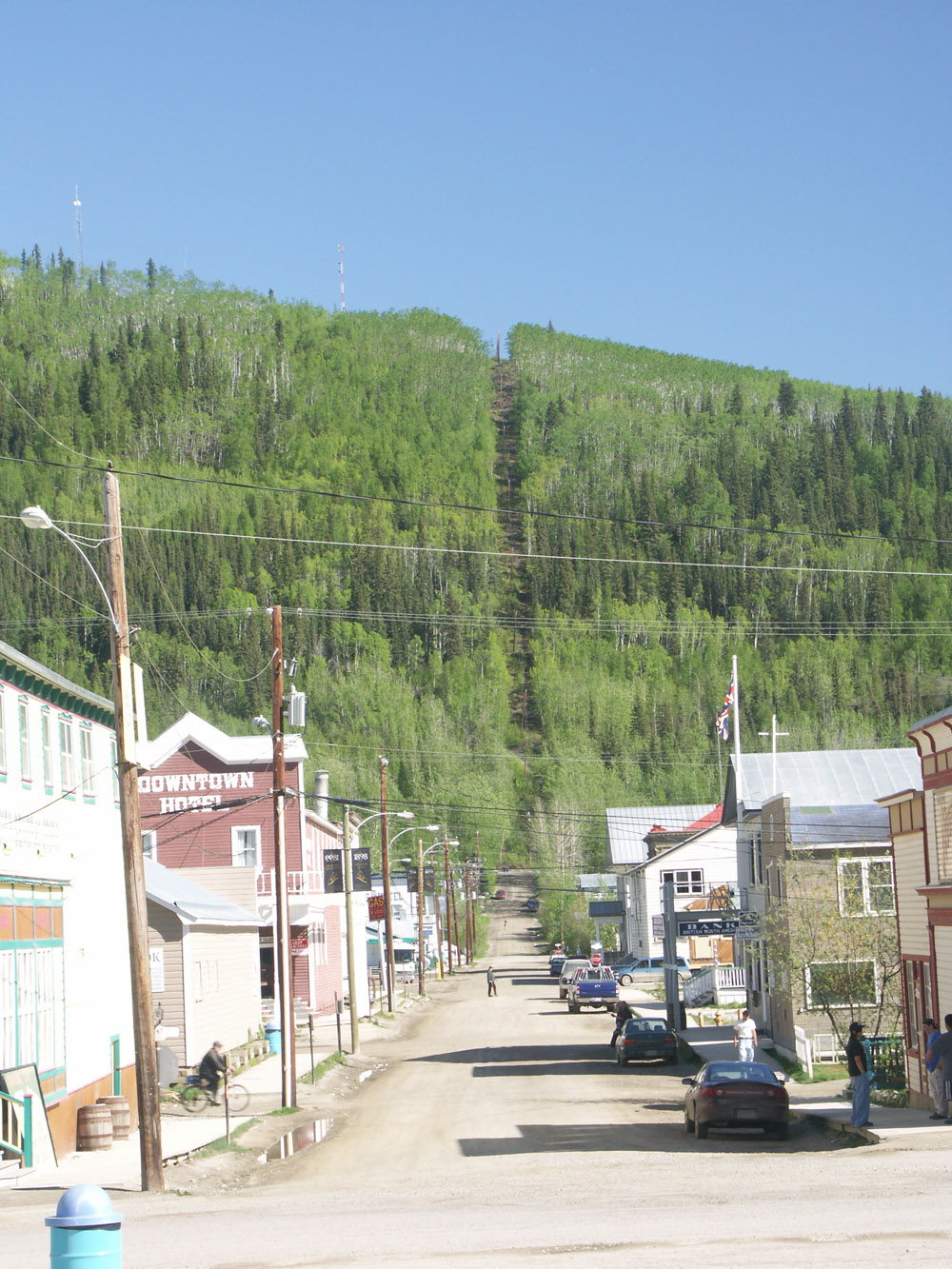 A view of downtown Dawson City. The gap going over the mountain carries all the phone lines.