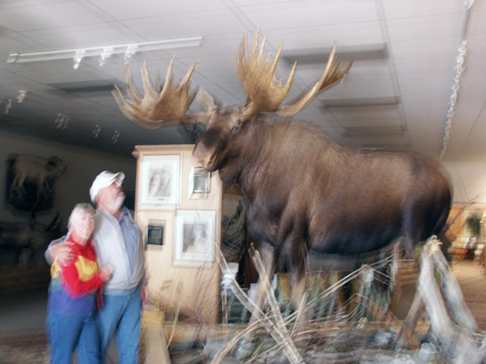 Sorry about the motion blur. The camera was held by a cashier and she must have moved. Even so, this shot communicates the impressive size of the average moose well enough. Ben looks like a Christmas elf by comparison. The curators had to shorten the legs of this beast to get it in the museum doors. It's eight feet tall, plus antlers.
