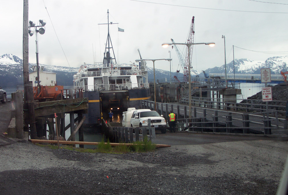 Ben cautiously backs the trailer down the ramp, across the water, into the guts of the ferry boat.