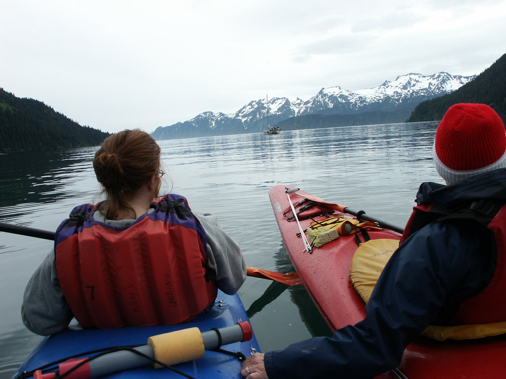 We floated up alongside each other, to parley over the route. The only way to stay connected is to grasp the bungee ropes of the adjacent kayak and hold on.