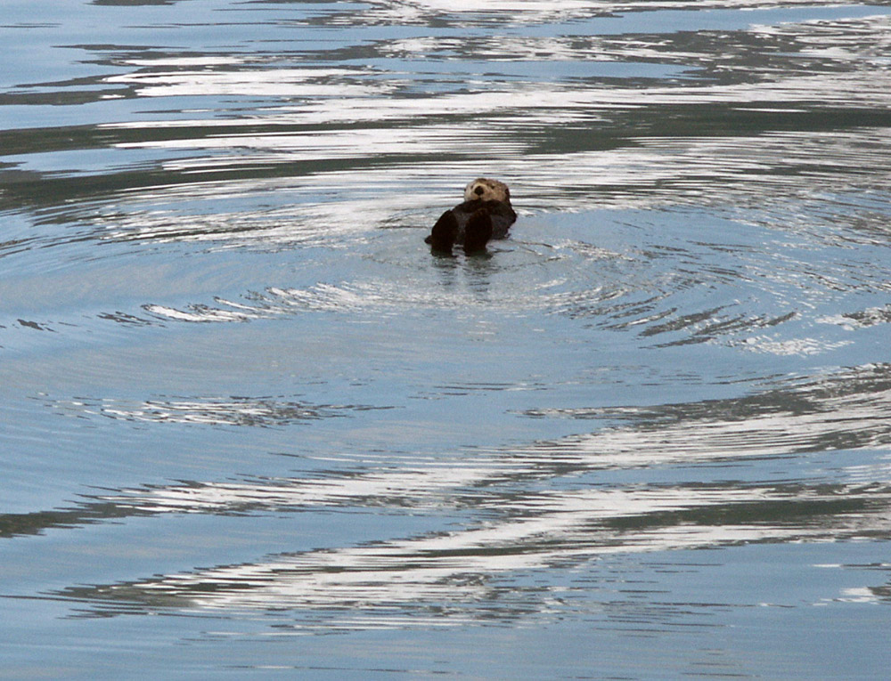 An otter floats by our deck. They keep their feet out of the water because those are the only parts of their body that aren't protected from the cold water by fur.