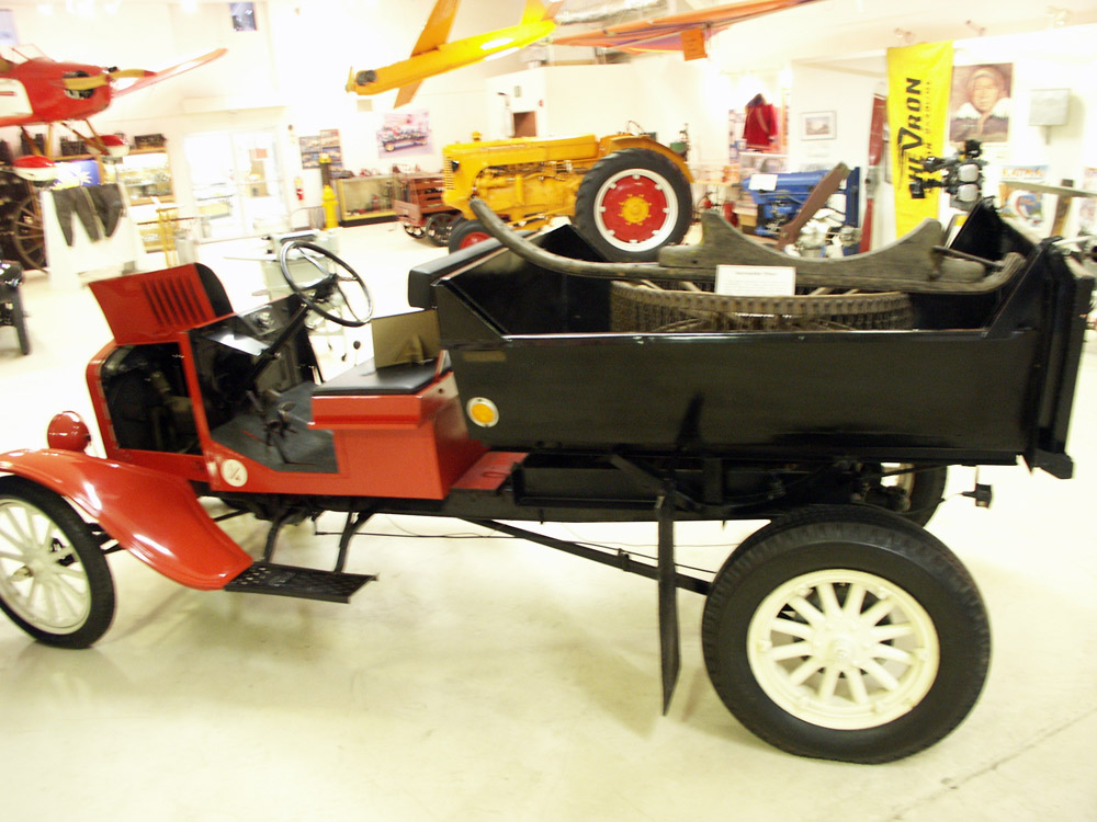 An old Ford truck with a dump bed added and a remarkable wheel in it.