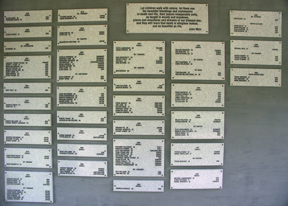 In the Talkeetna graveyard, this wall is erected, under a shelter. It gives the names of explorers, lost to the mountain.