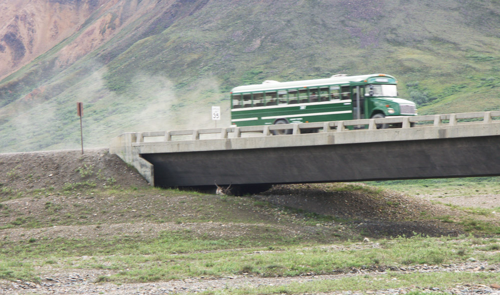 A view from the rest stop. Notice the caribou in the shade under the bridge.