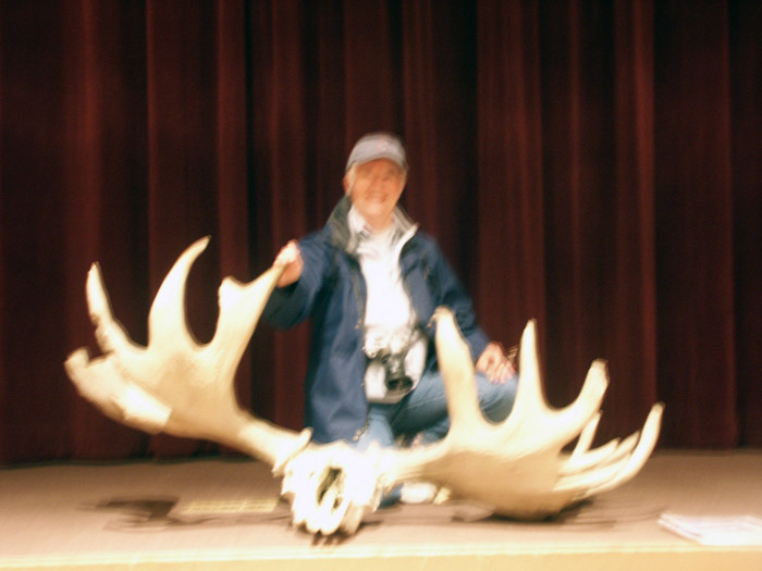 Blurry Margaret and a substantial set of moose horns that were on display.