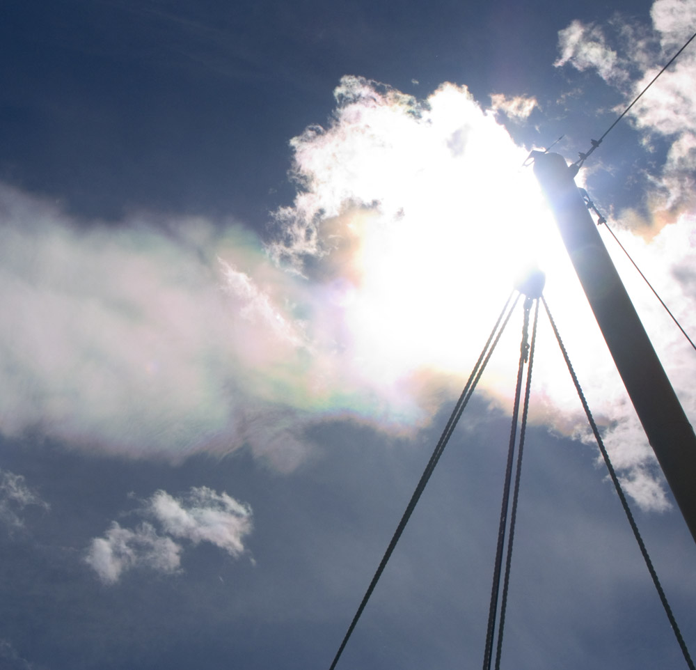 The sky above, from the deck of the ferry boat. My best theory about the bizarre coloration of the clouds is that a subtle gradient of temperature is freezing the water into different sized crystals. (I'm no meteorologist of course.)