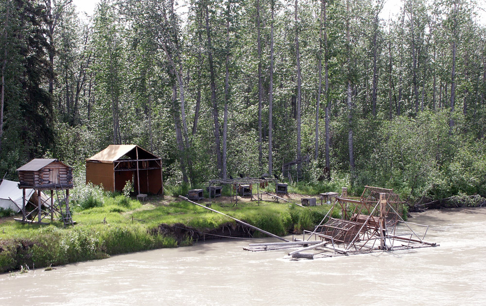 An example of a native campsite on the river. Note the tent, raised food cache, dog houses, fish drying rack and fish trap in the river. We don't know what the tall building is for.
