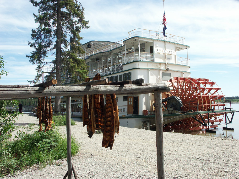 Another look at a fish-drying rack with our boat in the background.
