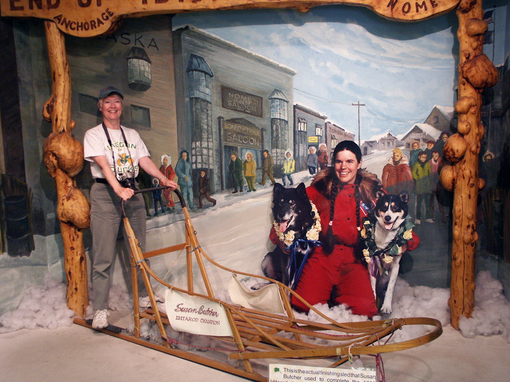 Margaret posing with a cardboard Susan Butcher, Iditarod champion.