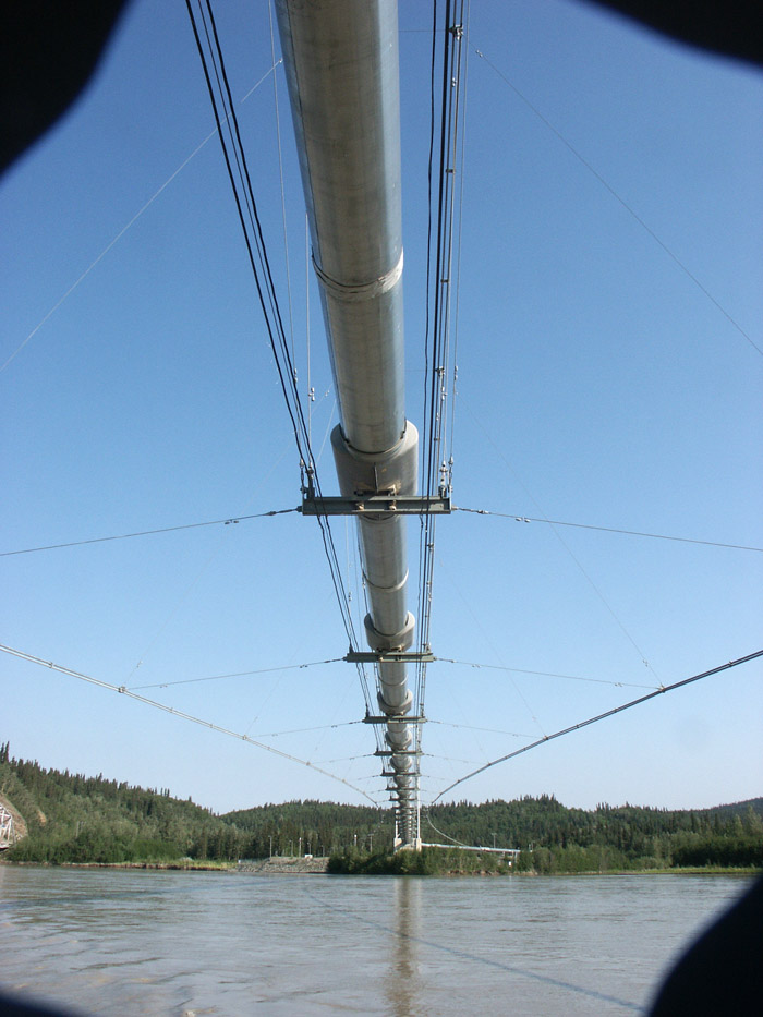 Under the pipeline bridge where it crosses the river.