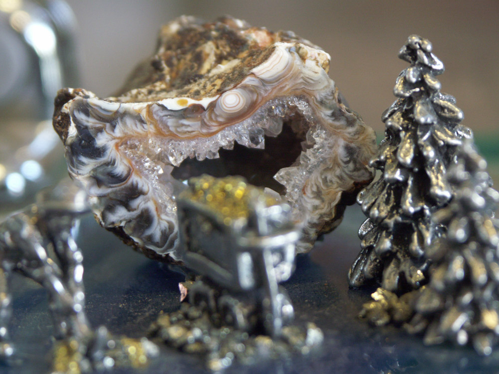 A beautiful geode and a brass tree.