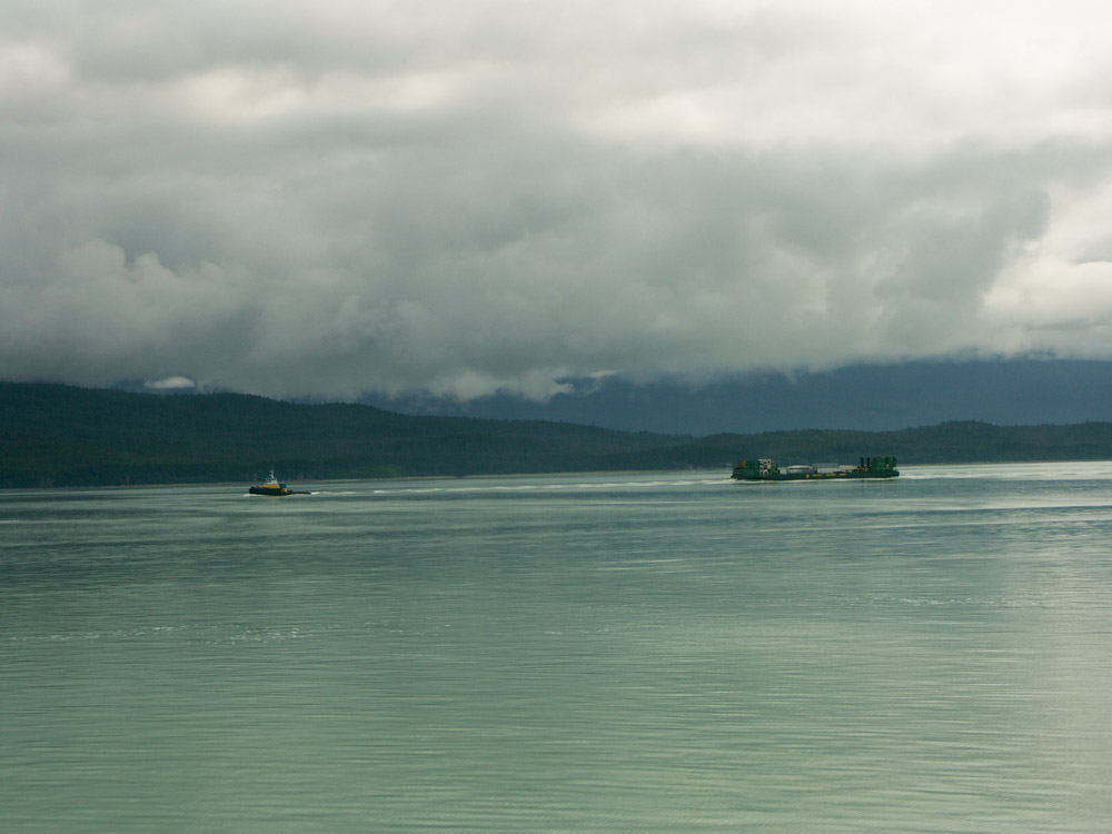 A tugboat hauls a barge through shadowy seas.