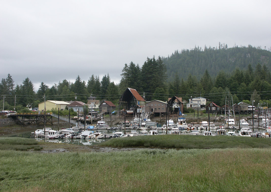 Looking out from Chief Shakes Island at some small boat businesses.