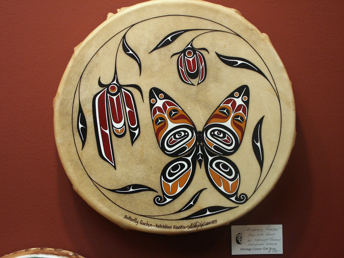 'Butterfly Garden', a deer hide drum made by artist Shelaigh Garson. $495.00.