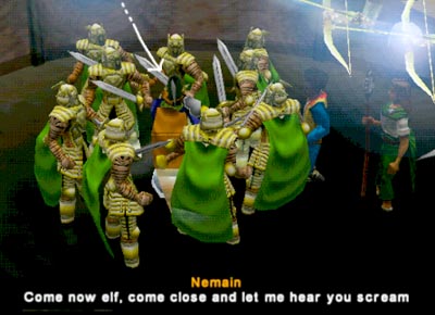 Strangely, the freezing action only affects creatures. Not projectiles. When an actor is speaking, only the actors get to move, but when the camera is making a zoom or a pan to go between conversations, fireballs and arrows resume their flight, for just an instant. I only mention this because it can have very amusing results. For example, in the picture above, you can see the blond head of an elf near the top between to blue swords. In that scene, just as the camera panned off the Chancellor so it could focus on the King, the elf got smacked by an arrow and keeled over with a loud "AAAAAaCK!" noise. Nobody else in the room moved. The effect was: