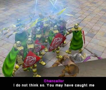 Now, when you're bum-rushing someone, the effect of the camera freeze is quite amusing. Observe this fine snapshot of the chancellor making his goodbye speech. I've added a white arrow so you can see his doomed ass in the throng. "You may have caught me, but the powers of Chaos will prevail!", he's saying. Just wait 'till the action resumes, buddy. Of course, he poofs out of existence when his speech is over. Drat.