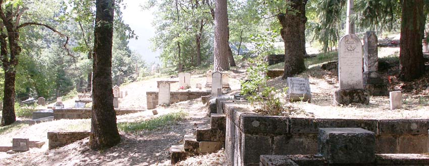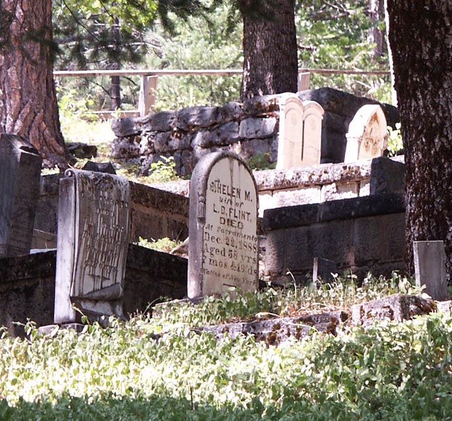 Sierra City graveyard is built into the hillside as a series of steps, with a central path bisecting it. Smaller paths run out along the steps, until each step peters out along the fringes of the graveyard. At the fringes, the graves simply lean uphill in patches of unbroken grass.