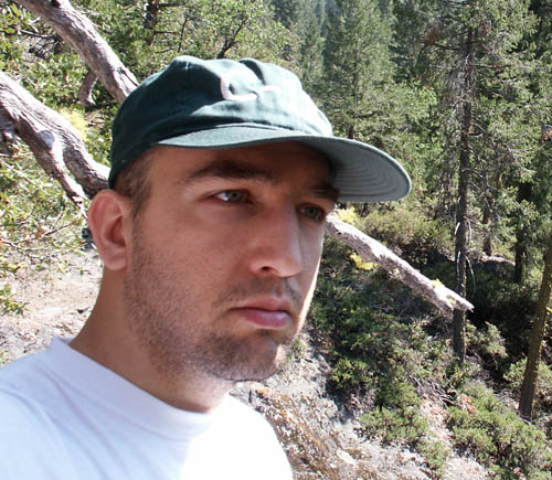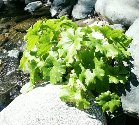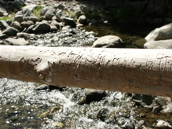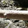 Primitive looking plants grow all along this river, and others like it in the Sierras. Some day I'll have to figure out the names of some of them. Deadfalls and accumulated brush from previous years of flooding make the way treacherous. Standing up from a successful jump, I bump my head on the underside of a bony tree, poking sideways out over the rocks. Luckily, my mysterious green hat absorbs the roughness of the impact.