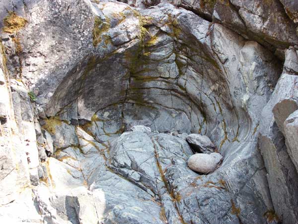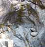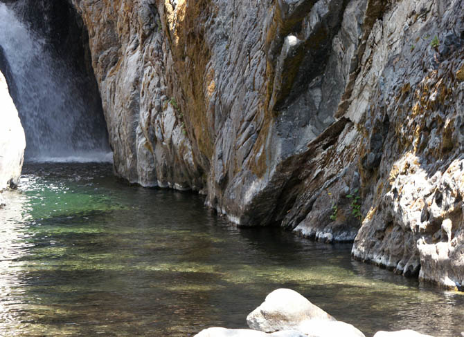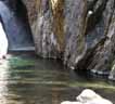Eventually I reach the first waterfall. Over countless years the river has carved a deep channel between two hillsides of compressed rock. If hikers have a very high tolerance for cold water, they can swim up the channel and paddle around at the impact zone. I don't think I've ever made it there, though I remember several of my friends succeeding in various years past. I snap a half-dozen pictures with the digital camera, cursing all the while that I really should read the instruction manual more. The contrast of sunlight and shade on opposite halves of the channel gives me trouble.