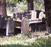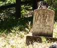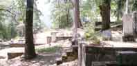 The whole site is surrounded on three sides by fencing of different kinds. Classy wrought-iron for the front, practical chicken-wire between posts on the left side, and rambling wooden fence at the back. The right side of the graveyard opens up to a clearing -- some local's private property, I assume. The ground is rocky everywhere in this valley, but it must have been especially hard to bury people here because of all the trees crowding this hillside. Then again, a graveyard laid in an open field would simply wash away.