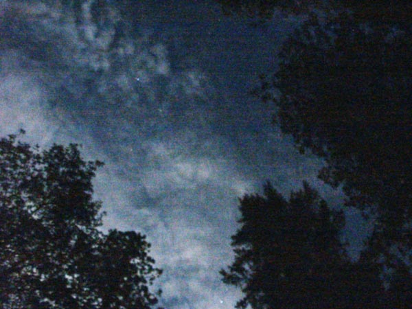 in the evening, I notice that the moon is out, and full. Now would be an excellent time to take some night photos with the camera. I slip on a flannel, and my iPod for mood music, and wander off into the cool blue world. For the first few shots I lie on my back in the middle of the road, with the camera resting on my face, to capture the constellations. All those shots turn out grainy. In fact, most of the pictures turn out grainy, and most of the rest are blurred from my hand-held exposure. Eventually I get the idea to prop the camera on rocks before I take a shot, building little piles of rocks as necessary.