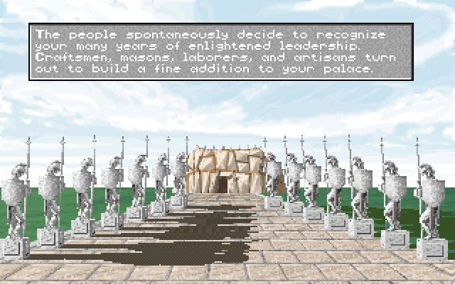My citizens wanted to add to my palace, and I resisted this operation for as long as possible, because I like living in a tent made of sticks and animal hides. It's rustic, and the smell is quite pleasant if you ventilate in the summer. I managed to convince them to leave my house alone and work on improving the driveway instead. That kept them busy for about 2000 years before I was finally forced - against my will! - to start adding extensions along the sides.