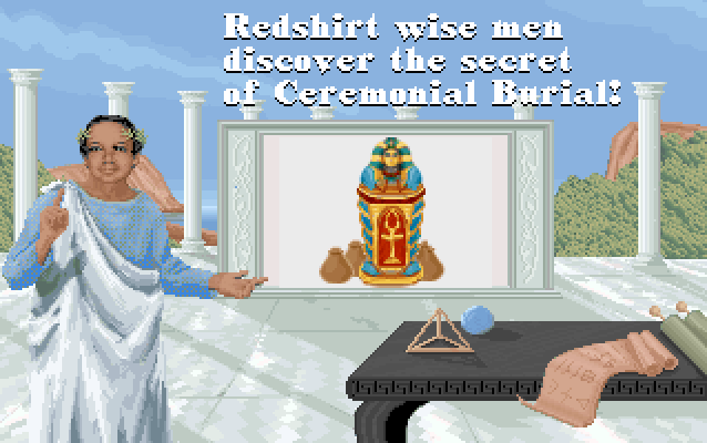 The Redshirts have developed ceremonial burial! Notice the guy on the left who appears to be my main science advisor. That's actually the spitting image of Sid Meier himself, right down to the mole on his left cheek. I'll bet all you civilization players didn't know that, huh?