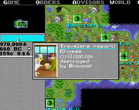 While I was busily attending to my fledgling civilization, I received a "traveler's report" that the Chinese had been destroyed by the Romans. Nice to know that there was bloodshed and mayhem elsewhere in the world. Also, is it just me, or do those travelers look suspiciously like muppets?