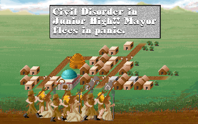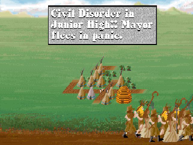 Just look at those giddy townspeople. Whenever a spontaneous celebration like this breaks out, it's an embarrassment, and a mixed blessing, because usually to get your citizens that happy you have to take them off work, which means that no one is tending the fields. For every turn they celebrate, the food stores decline, setting the stage for starvation. In a way it's like the hangover after the party ... but instead of a headache they get tasty death.