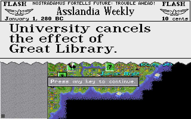 Finally in the year 280 BC the Asslandia Weekly reported that the effects of the Great Library were canceled, by some foreign civilization developing the University. This was an inevitable blow, but I considered the mission accomplished, since I had ridden the intellectual coattails of my cheating companions for about 500 years without doing a jot of research.